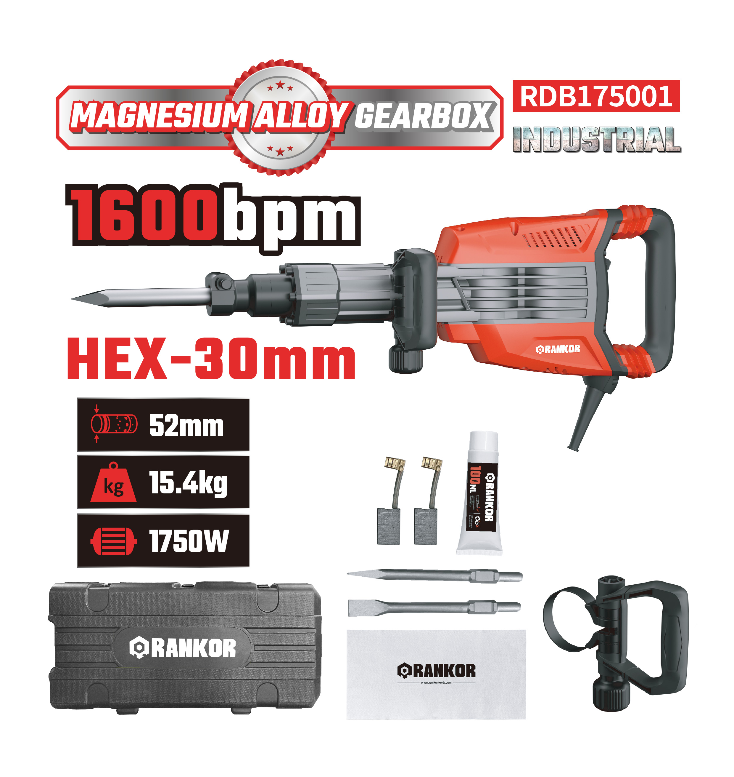 Auxiliary handle *1; Chisel (pointed 410mm / flat 30*410mm) *2; Carbon brush (set) *1; Lubricating oil *1; Cleaning cloth *1; 3m Cable *1