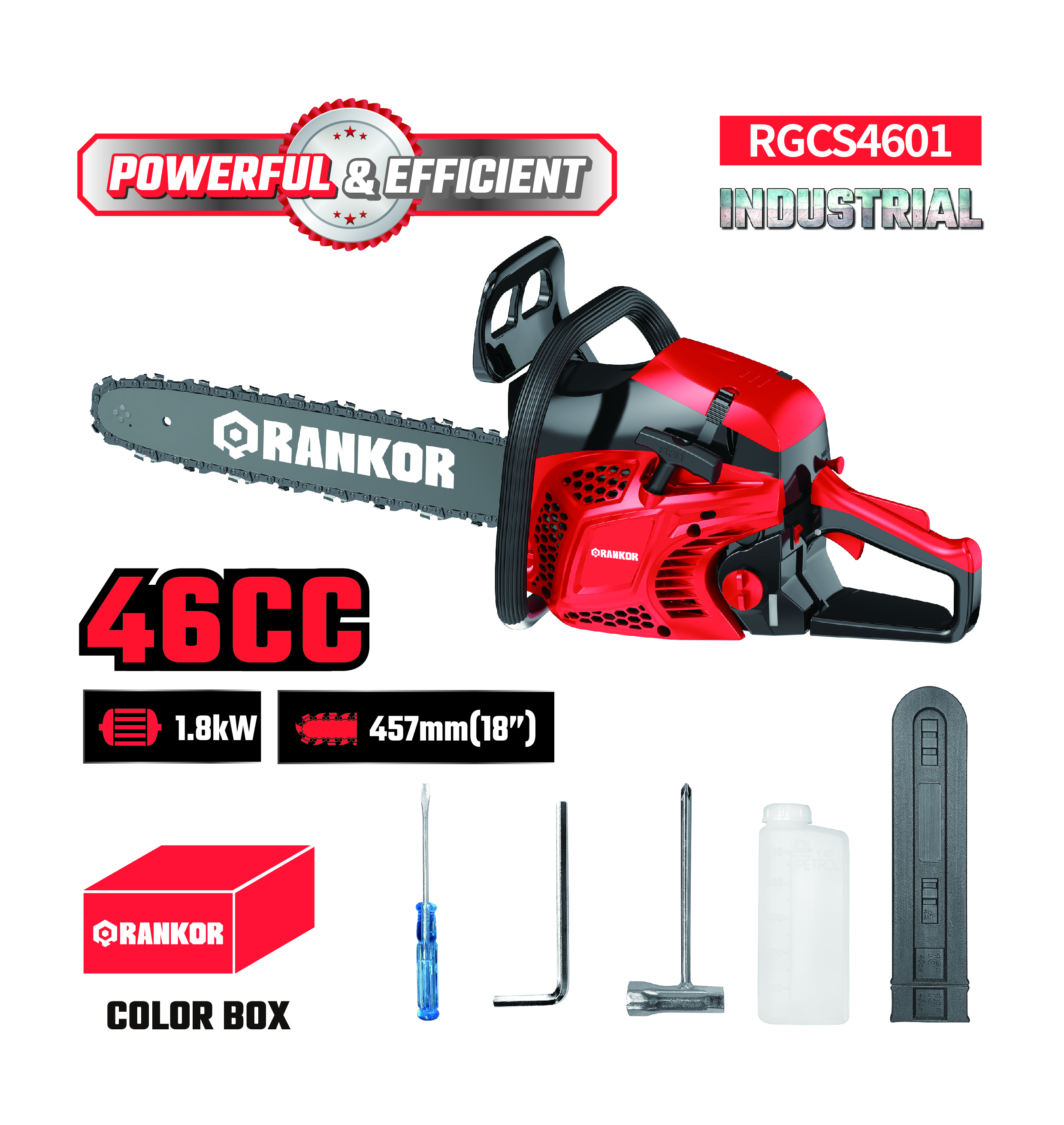 Mixing cup *1; Tool bag *1; 18" Guide bar *1; 18" Chain *1 (Chain Pitch: 0.325", Chain Gauge: 0.058")