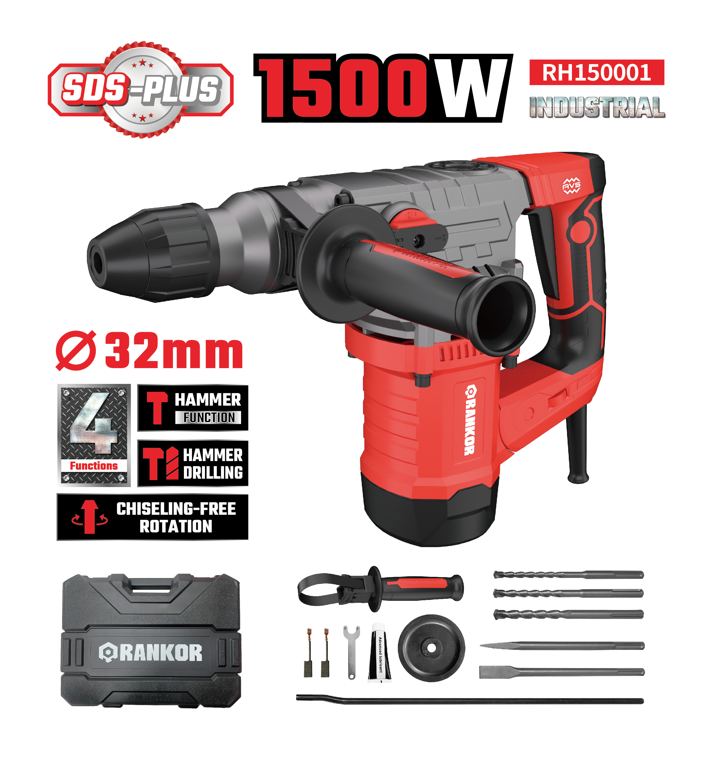 Point chisel *1 Flat chisel *1 SDS plus drill bits (8/10/12*150mm) *3 Depth stop *1 Wrench *1 Grease *1 Dust cover *1 Auxiliary handle *1 Carbon brush *1 set Instruction manual *1