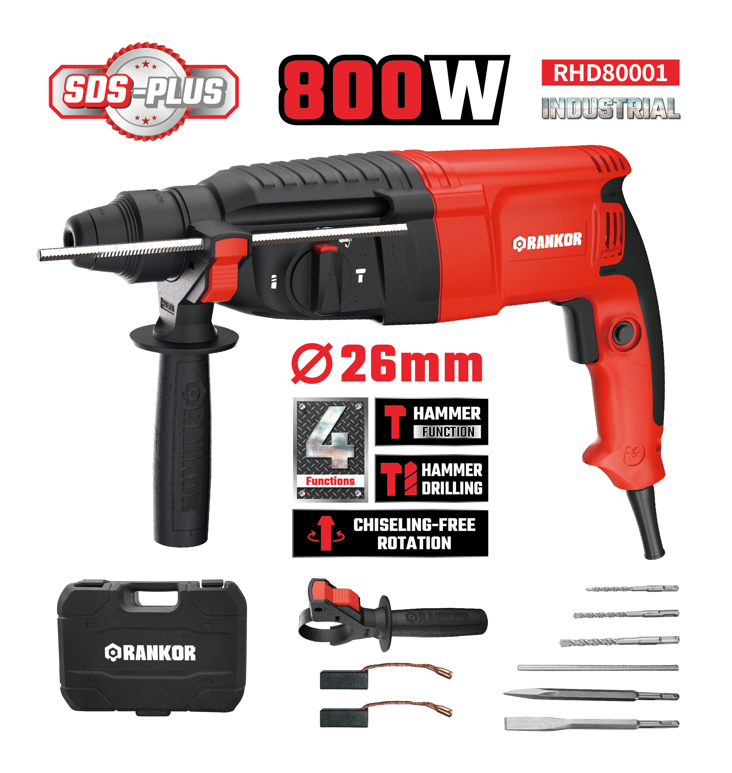 Depth stop *1 Auxiliary handle *1 Drills (6/8/10*150mm) *3 Point chisel (14*250mm) *1 Flat chisel (14*250mm) *1 Carbon brush *1 set Instruction manual *1