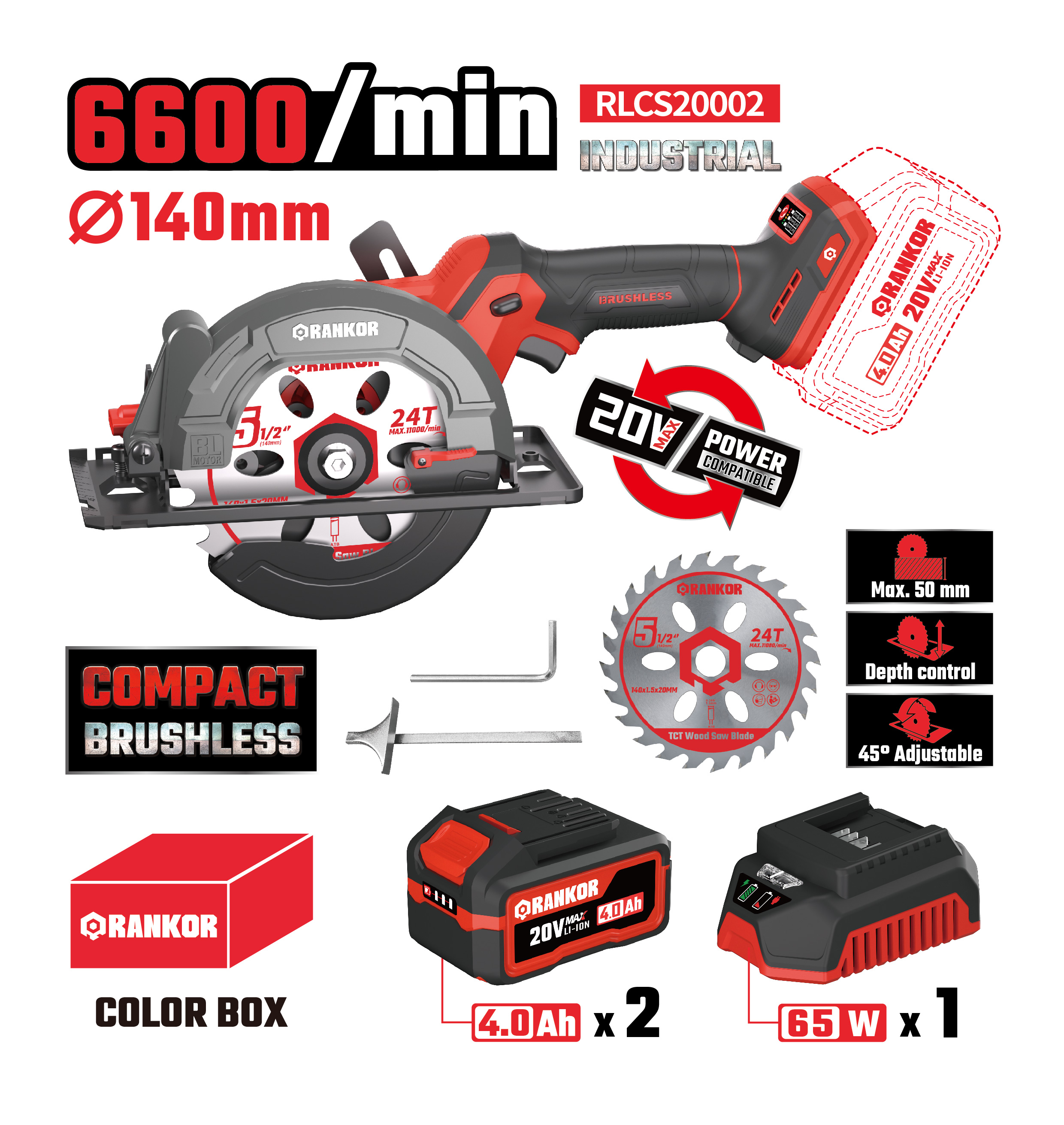 140mm saw blade *1 Wrench *1 Depth gauge *1 Carbon brush *1 set Instruction manual *1 4.0Ah battery packs *2