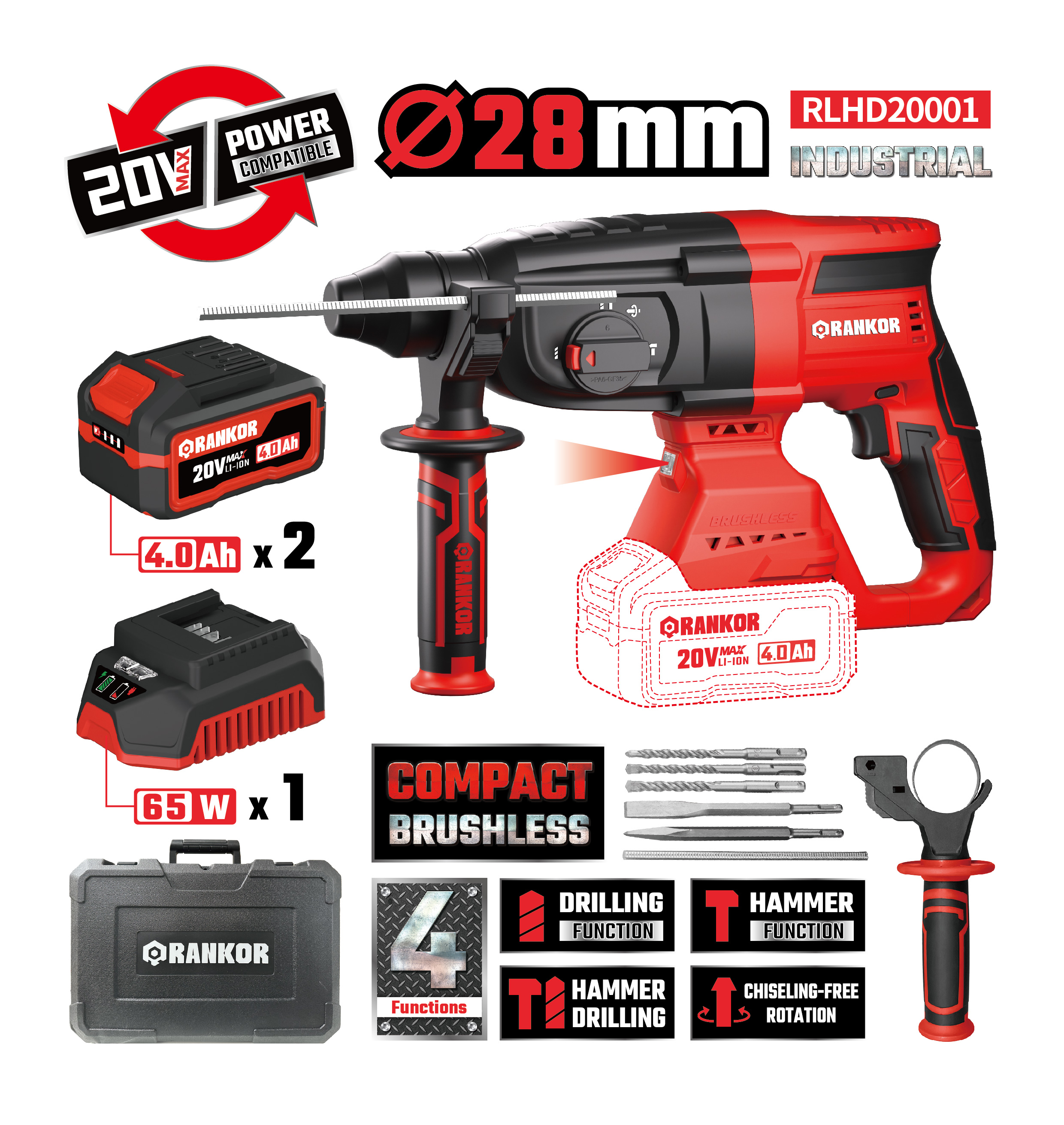 Depth stop *1 Auxiliary handle *1 Drills (6/8/10*140mm) *3 Point chisel (14*250mm) *1 Flat chisel (14*250mm) *1 4.0Ah battery packs *2 Battery charger *1 Instruction manual *1